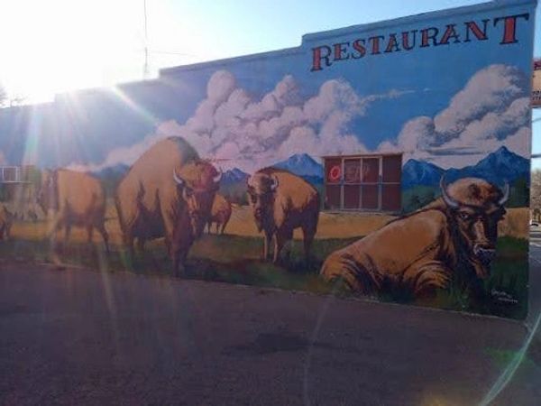 Change is about to happen at the Bison Breath Bar & Restaurant in Ault. The last change to the space, owned by VFW Post 4334, was 23 years ago when Ben Janssen and Jeanie McCall leased the space. At that time they changed the ceiling tiles, put carpet on the upper part of the walls, and added a sound control booth and dining booths. Ben liked to play his music loud, so large speakers were also added. An itinerant painter traveled through Ault and stopped by Continental Supply in offering to paint a mural on the side of their building. They declined because they were going to build an addition covering their wall, but they suggested he talk to Ben & Jeanine at the Bison Breath. They hired the painter, and the following murals was created.